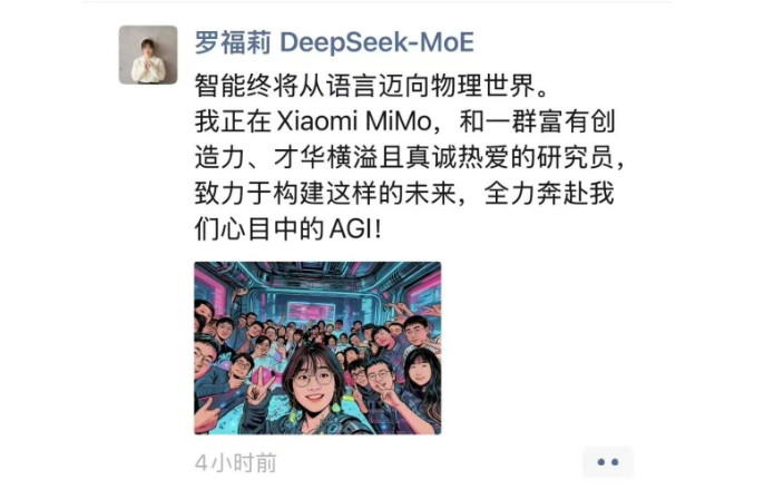 11月12日,网上流传一张疑似罗福莉加入小米的图片。图片中罗福莉以C位之姿,首次对外官宣了小米任职。另有消息称,她在朋友圈表示,“智能终将从语言迈向物理世界。我正在XiaomiMiMo,和一群富有创造力、才华横溢且真诚热爱的研究员,致力于构建这样的未来,全力奔赴我们心目中的AGI。”